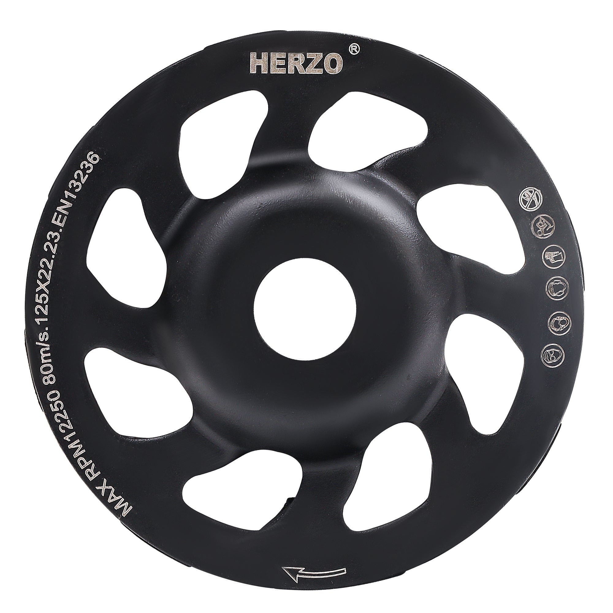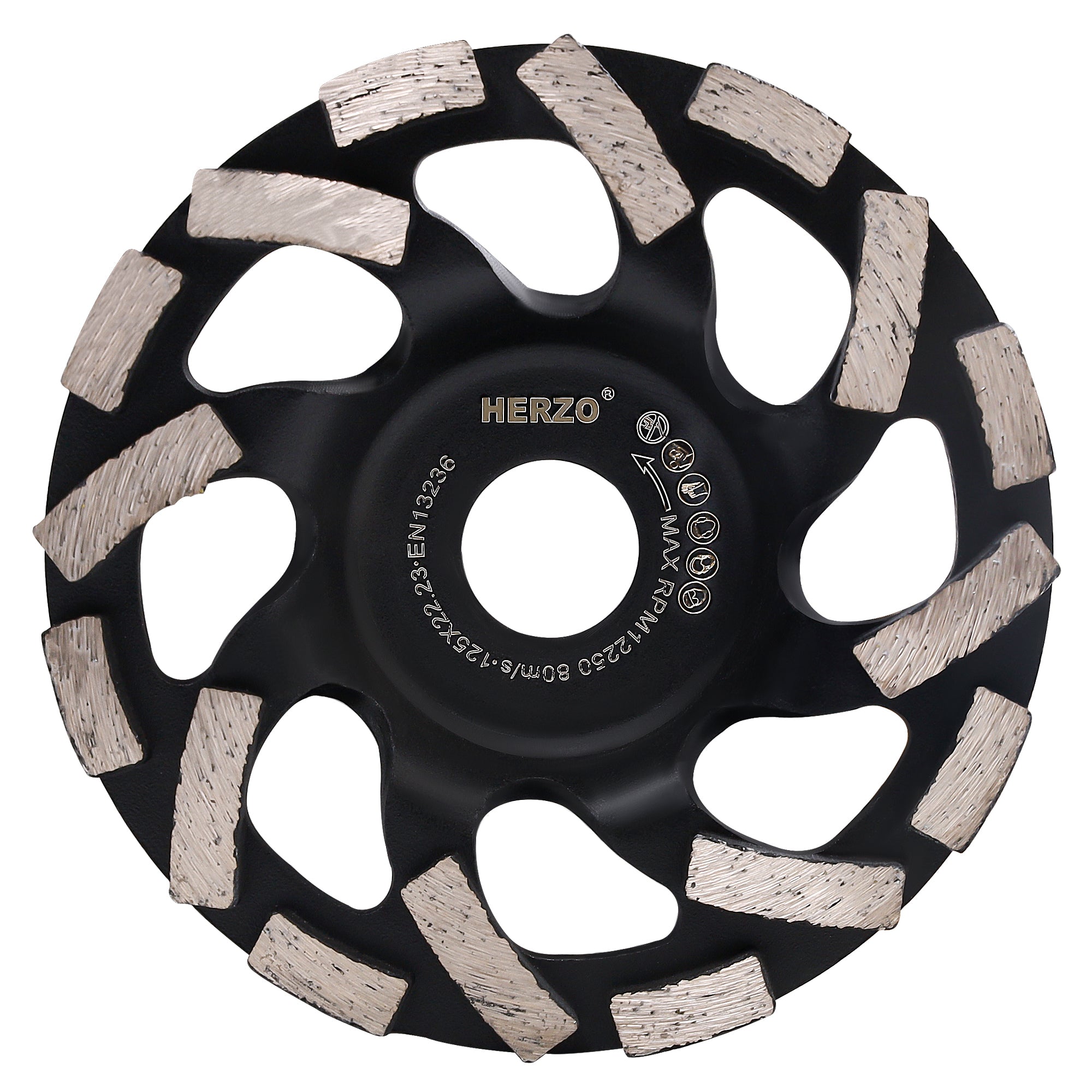 The HERZO HSO9.0E double‑row diamond cup is engineered for surface leveling and shaping on concrete, mortar and natural stone. The double‑row layout increases contact area and opens multiple debris‑flow channels for faster removal, smoother evacuation and lower heat, delivering stable long passes and cleaner lines. Specs: 125mm diameter, 22.23mm (7/8") arbor, 22mm thickness, max 12,250 rpm. Use dust extraction and follow EN13236/tool RPM limits.