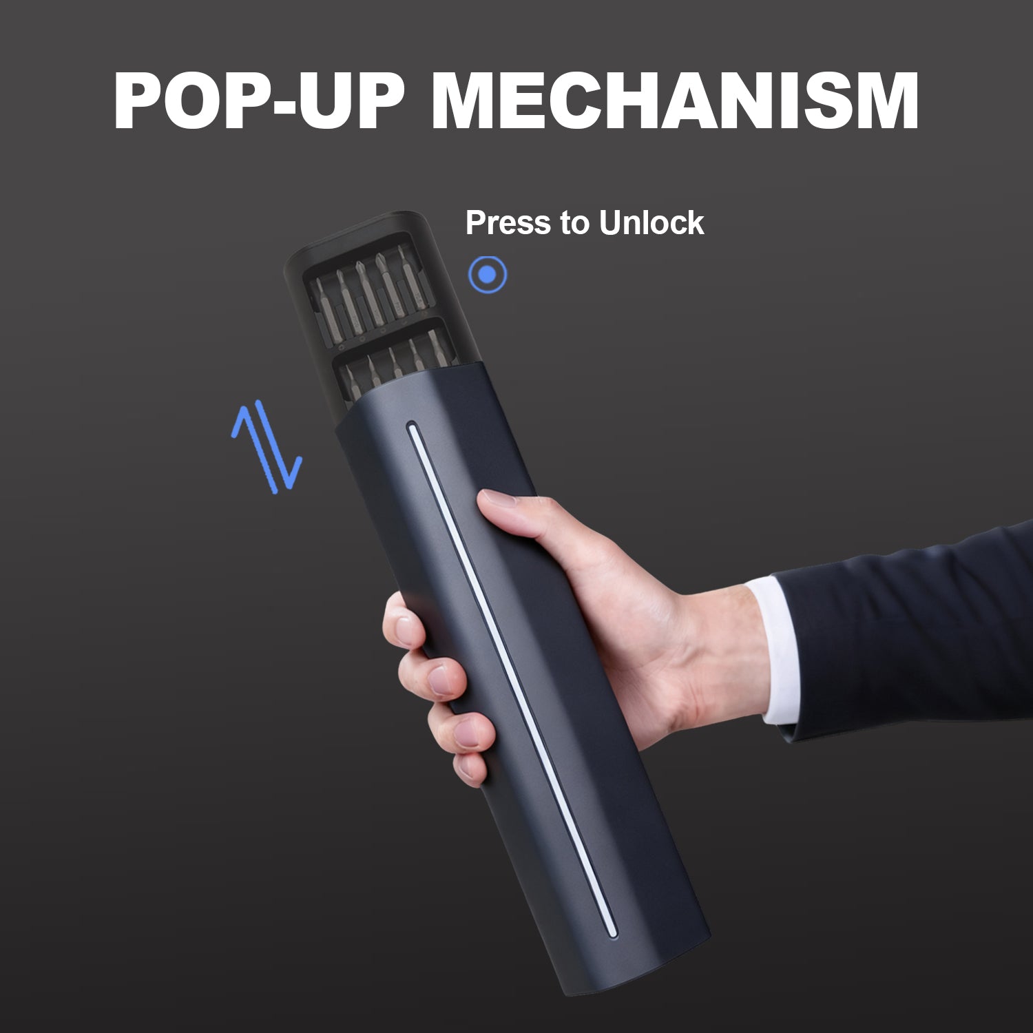 The magnetic case features a pop-up mechanism and keeps the driver and all bits organized. The rechargeable battery charges via Type-C and drives approximately 400 standard screws (2.5 × 5 mm) per charge. A 200 RPM motor delivers stable performance while the lightweight body and precise torque control make repair work faster and safer.