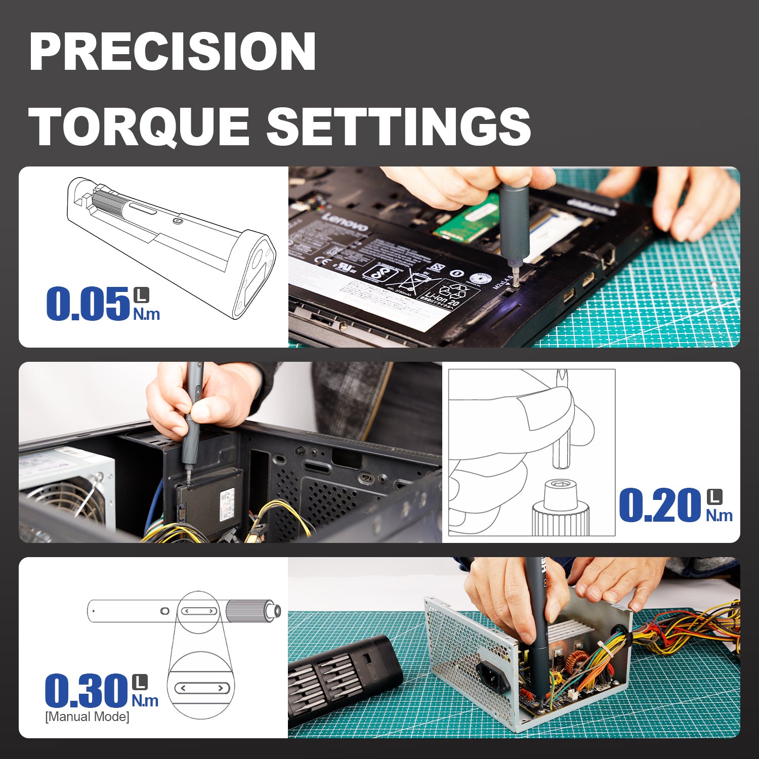 - Low electric mode (0.05 Nm): For sensitive components like watch backs, phone screens, or fragile plastic housings